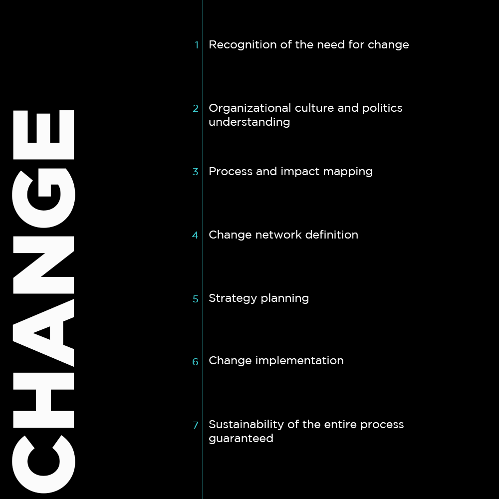 Change Management involves the design, planning, organization, implementation, control and stabilization of a company's change processes. Its goal is to maximize the effectiveness and efficiency of change processes and to be widely accepted by leaders and employees.